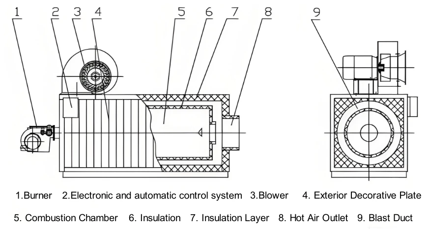 WRF series oil/gas hot air furnace uses diesel or natural gas as fuel and air as the heat carrier, delivering clean hot air via forced circulation. It adopts multi-layer spiral groove heat exchange and turbulence technology to enhance heat transfer, while the inner tank design keeps heated air isolated from flue gas for clean output.